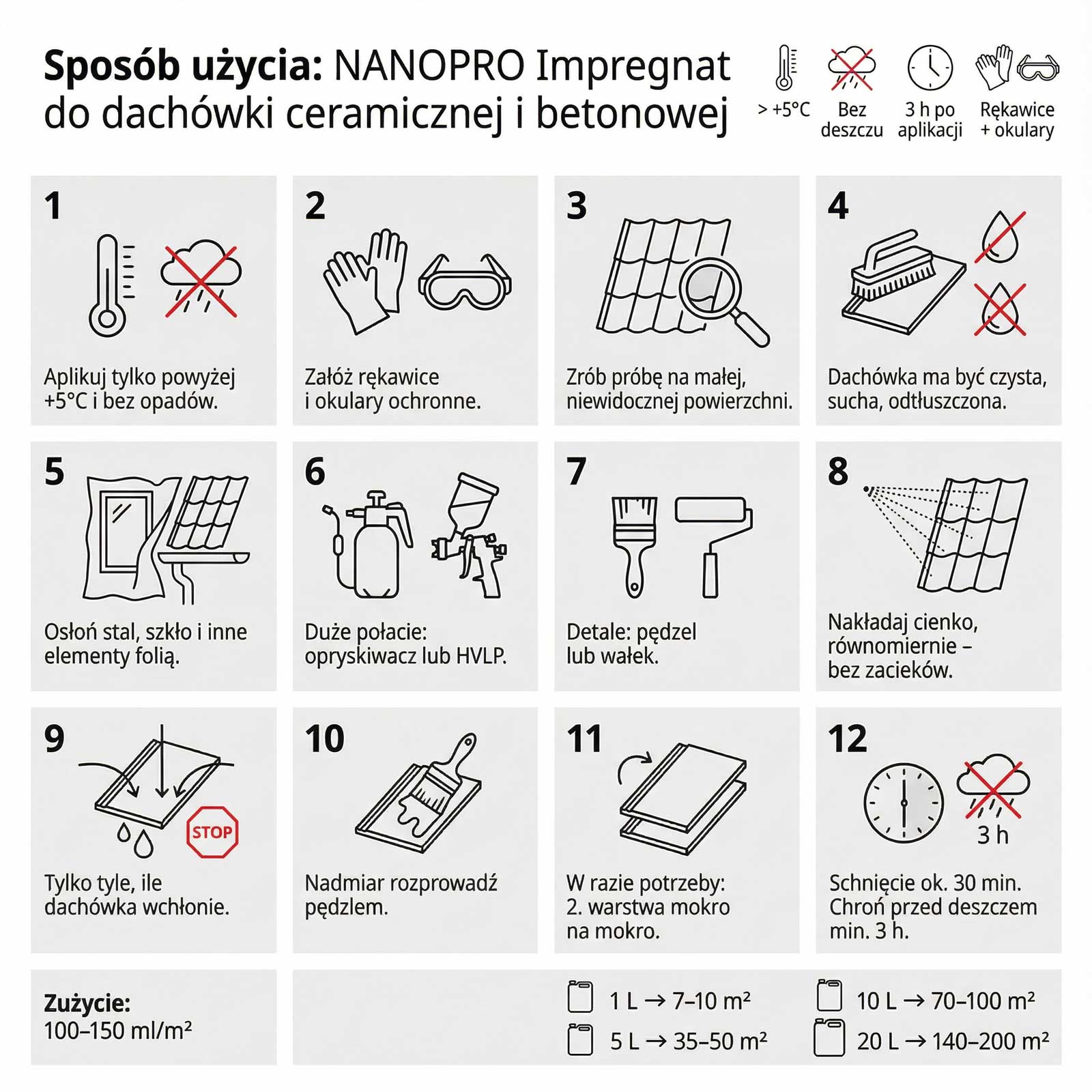 • Czas schnięcia: Pozostaw impregnat do całkowitego wyschnięcia – zwykle zajmuje to około 30 minut.NANOPRO Impregnat do dachówki ceramicznej i betonowej