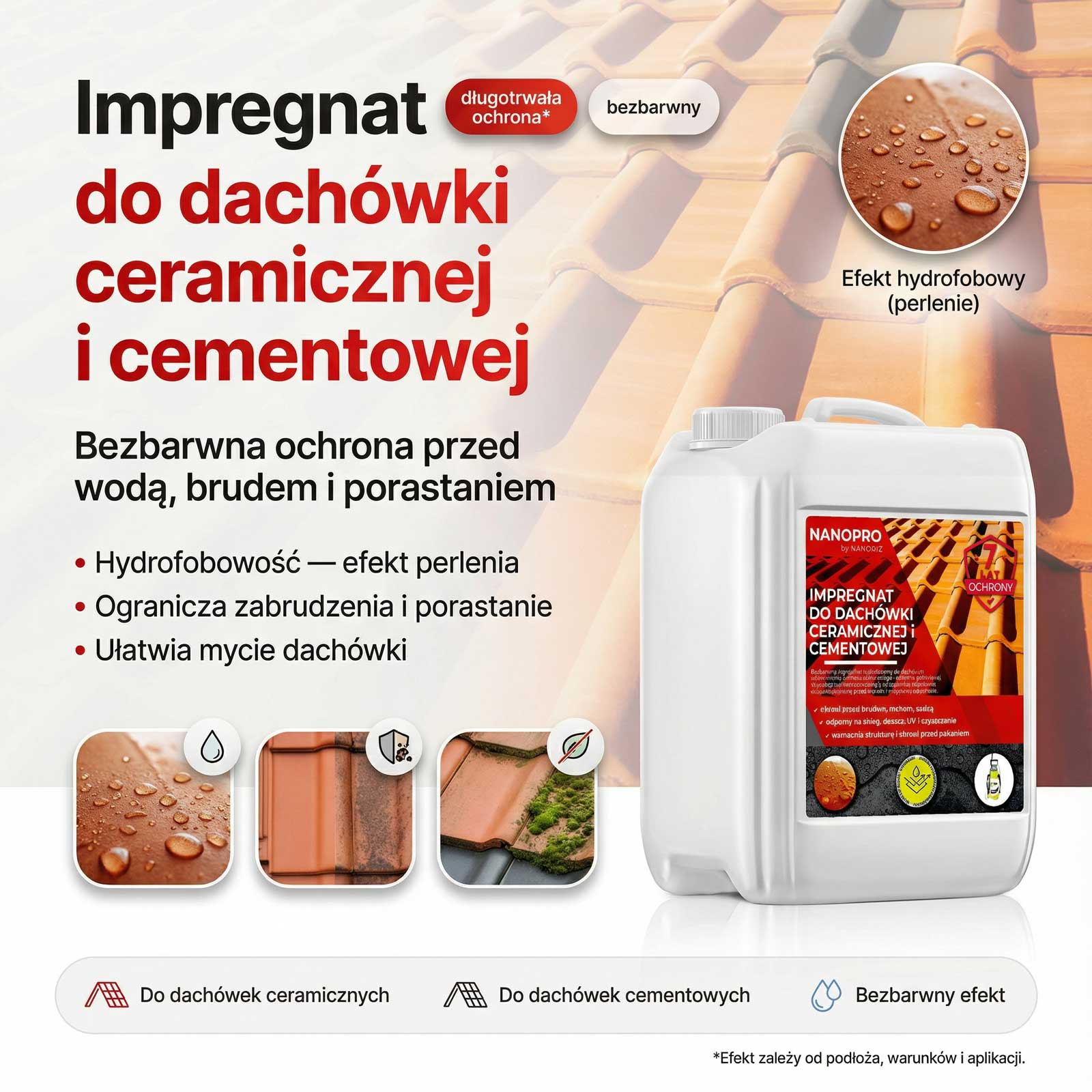 NANOPRO Impregnat do dachówki ceramicznej i klinkieru – skuteczna ochrona Twojego dachu na długie lata! Zapewnij swojej dachówce długotrwałą ochronę dzięki innowacyjnej formule NANOPRO, wykorzystującej najnowszą technologię nanocząsteczek. Impregnat skutecznie chroni dachówki ceramiczne oraz betonowe przed wodą, zabrudzeniami, glonami oraz negatywnymi skutkami warunków atmosferycznych, takich jak mróz, deszcz i promieniowanie UV. Dzięki zaawansowanej hydrofobowej powłoce dachówka zachowuje estetyczny wygląd, pozostając czysta i odporna na zazielenienia przez wiele lat. Preparat umożliwia swobodne oddychanie materiału, zapewniając równocześnie poprawę właściwości termoizolacyjnych.