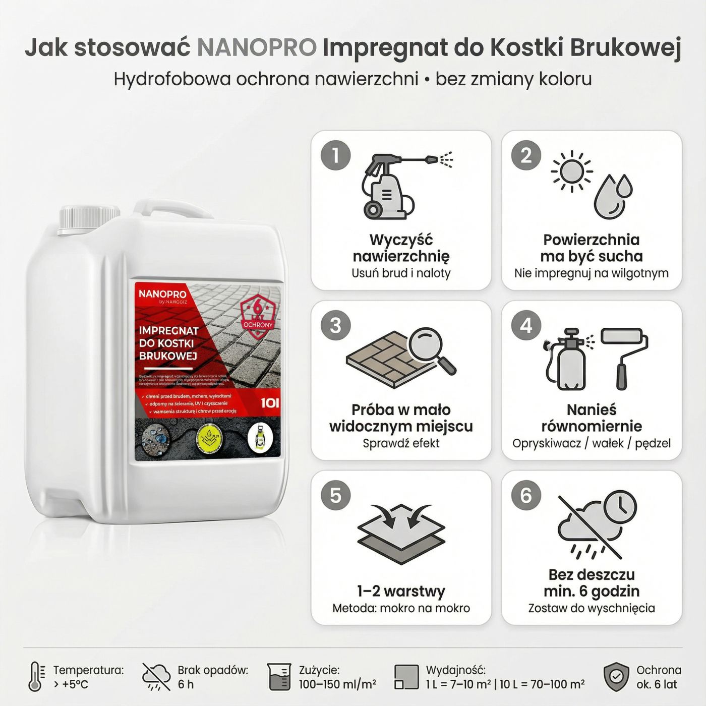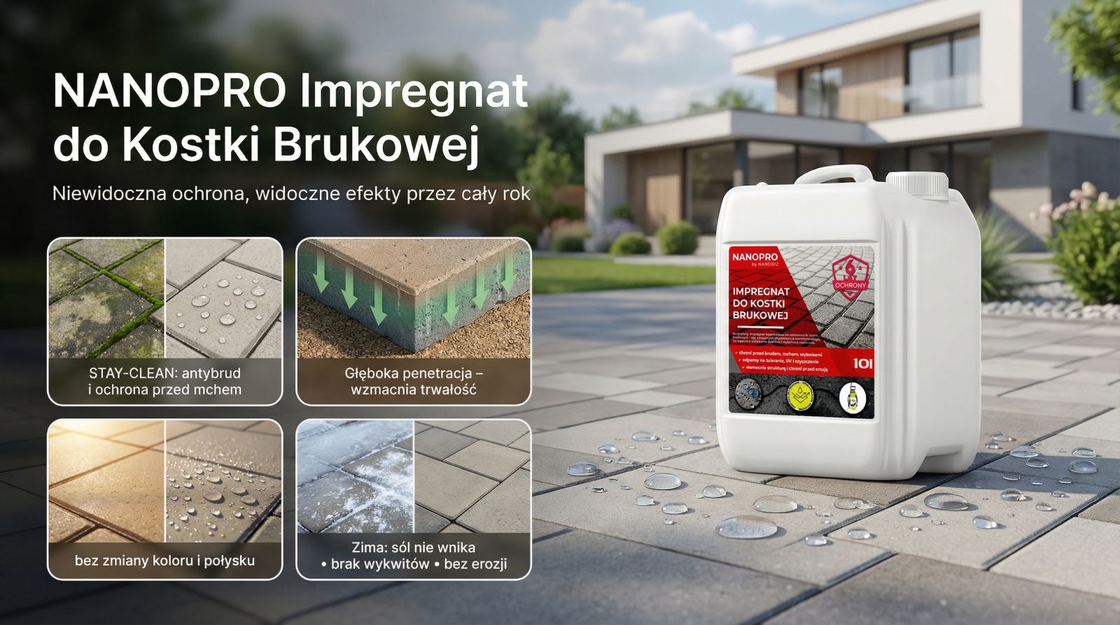 NANOPRO IMPREGNAT DO KOSTKI BRUKOWEJ to nowoczesny produkt, który zapewnia wyjątkową ochronę nawierzchni brukowych w zmieniających się warunkach pogodowych oraz przy intensywnym użytkowaniu. Dzięki innowacjom w nanotechnologii opartym na cząsteczkach silanów, impregnat gwarantuje niezwykle skuteczne i długotrwałe efekty. Cząsteczki te doskonale przylegają do powierzchni, zwiększając odporność kostki na zabrudzenia oraz porastanie mchem. Ważnym atutem tego produktu jest brak wpływu na naturalny wygląd impregnowanej nawierzchni oraz całkowita odporność na promieniowanie UV, co zapewnia trwałość i estetykę na długie lata.
