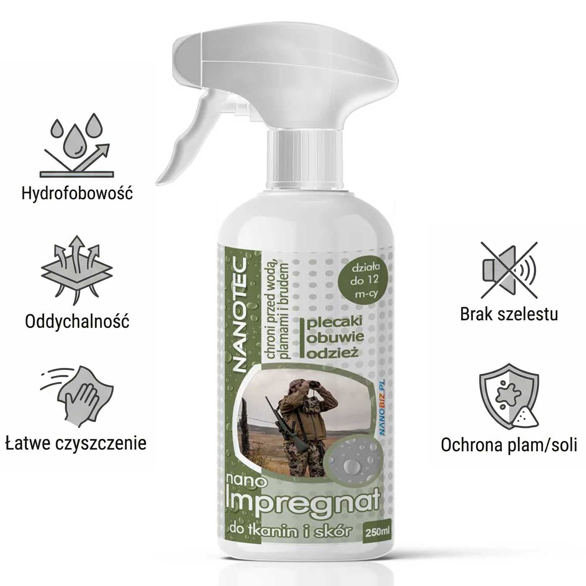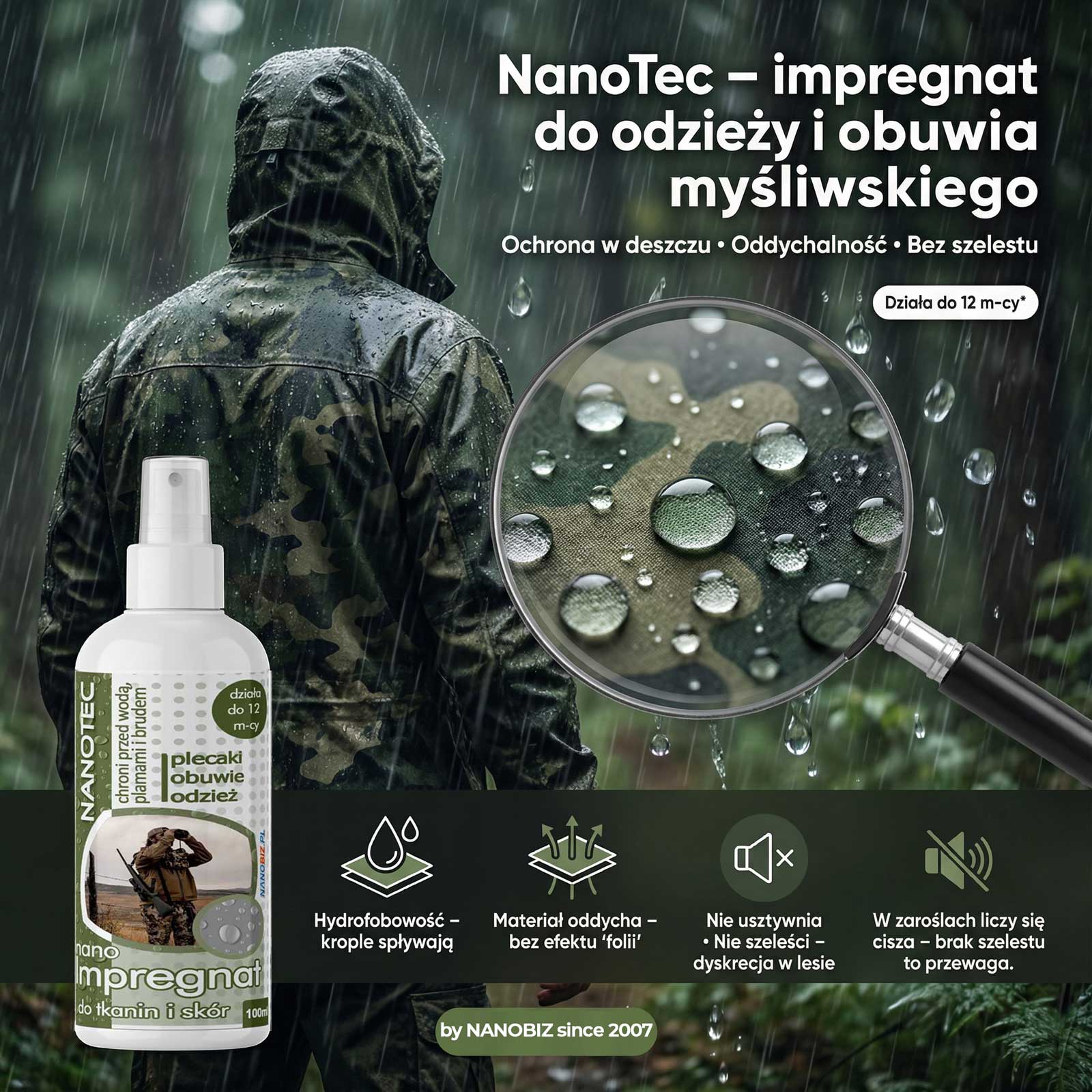 NanoTec Impregnat do odzieży i obuwia myśliwskiego to innowacyjny, w 100% paroprzepuszczalny preparat hydrofobowy, który skutecznie chroni odzież terenową przed przemoczeniem, solą oraz trudnymi zabrudzeniami. Po aplikacji tworzy na włóknach niewidoczną warstwę ochronną, dzięki której woda perli się i spływa, a tkanina nadal zachowuje oddychalność – bez efektu „folii” i bez natłuszczania. NanoTec Impregnat do odzieży i obuwia myśliwskiego myśliwskiego jest wyjątkowo wydajny: 100 ml wystarcza na ok. 1 m² (zużycie zależy od chłonności materiału oraz powierzchni obuwia), co czyni go praktycznym rozwiązaniem do regularnej konserwacji ubrań i sprzętu outdoor.