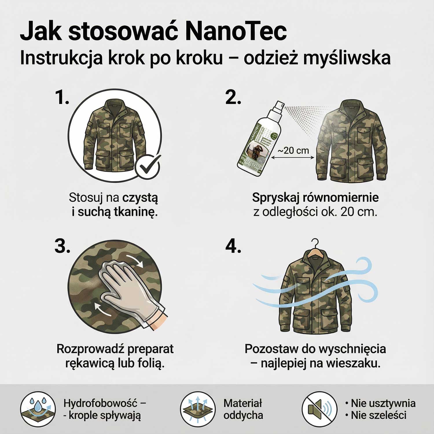 | Impregnować na sucho czy na mokro? | Najpewniej: na czystą odzież po praniu – suchą lub lekko wilgotną (zależnie od materiału). Klucz to cienka, równa warstwa i pełne wyschnięcie. Stosując NanoTec Impregnat do odzieży i obuwia myśliwskiego, zawsze zapewnij czas na związanie preparatu. |