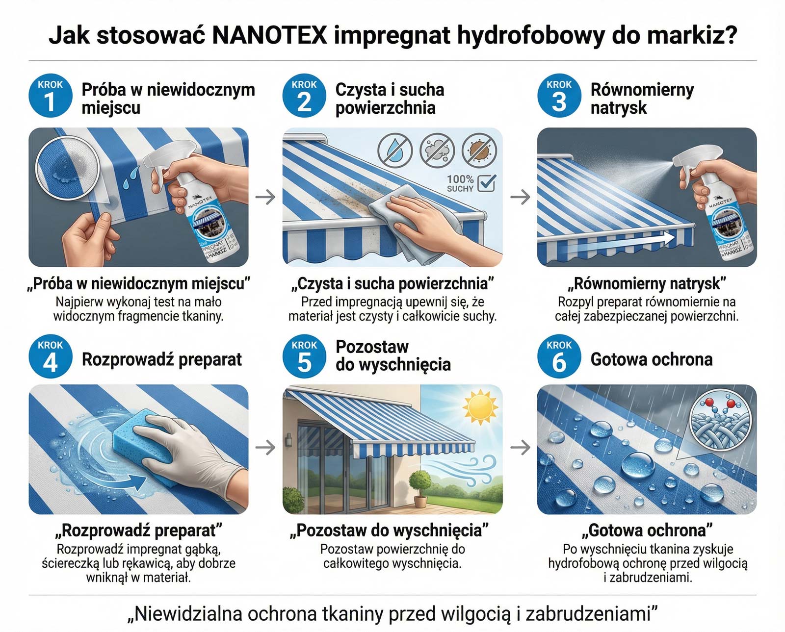 | Czy NanoTex impregnat hydrofobowy do markiz i parasoli zmienia wygląd tkaniny? | Nie. Preparat nie powoduje przebarwień, nie natłuszcza i nie pozostawia smug. Po wyschnięciu pozostaje całkowicie niewidoczny. |