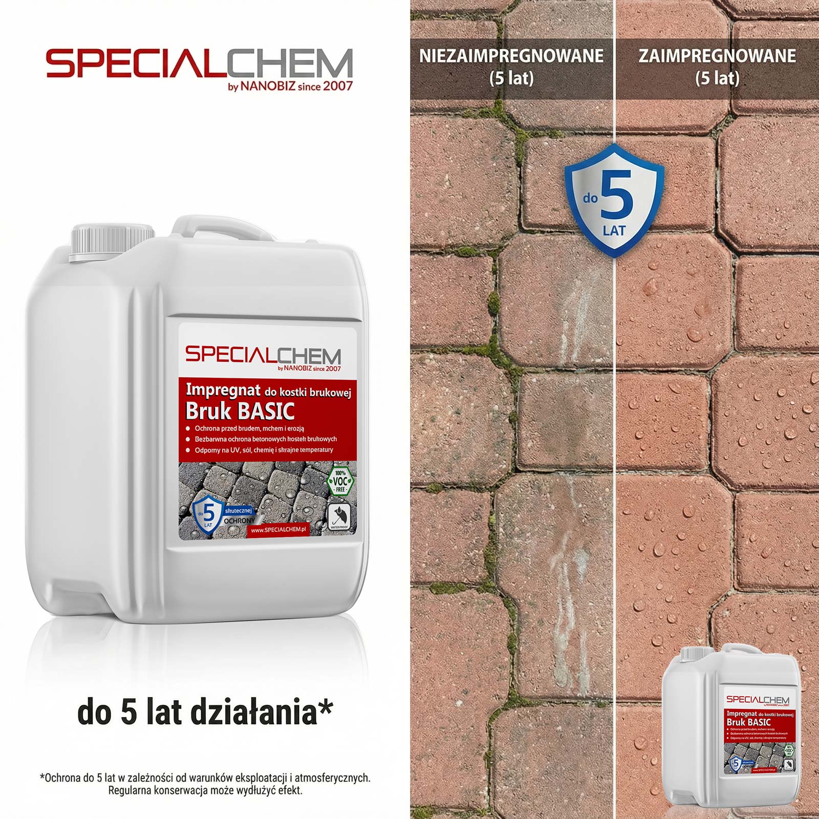 | Ile impregnatu potrzebuję? | SPECIALCHEM Bruk Basic impregnat hydrofobowy do kostki brukowej ma wydajność zależną od chłonności: 1 L na 7–10 m², 5 L na 35–50 m², 10 L na 70–100 m², 20 L na 140–200 m². |