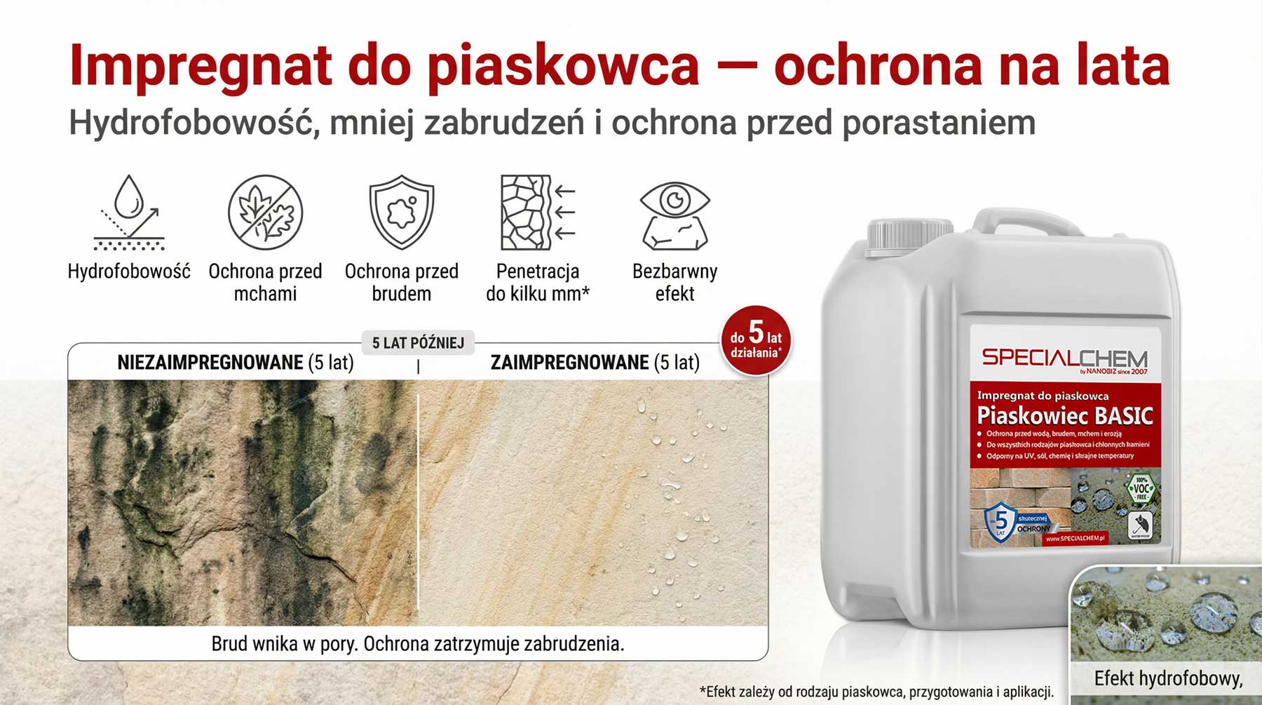 SPECIALCHEM PIASKOWIEC BASIC – Impregnat do hydrofobowej ochrony piaskowców to profesjonalny preparat do zabezpieczania piaskowca oraz innych kamieni chłonnych na elewacjach, murach, ogrodzeniach i posadzkach. Impregnat tworzy hydrofobową barierę wewnątrz struktury kamienia, dzięki czemu redukuje chłonność, ogranicza wnikanie wody i zabrudzeń oraz poprawia odporność powierzchni na czynniki atmosferyczne. Zastosowana technologia pozwala zachować naturalną paroprzepuszczalność – kamień nadal „oddycha”, a jednocześnie jest skutecznie chroniony przed wilgocią, solami i przyspieszoną degradacją.