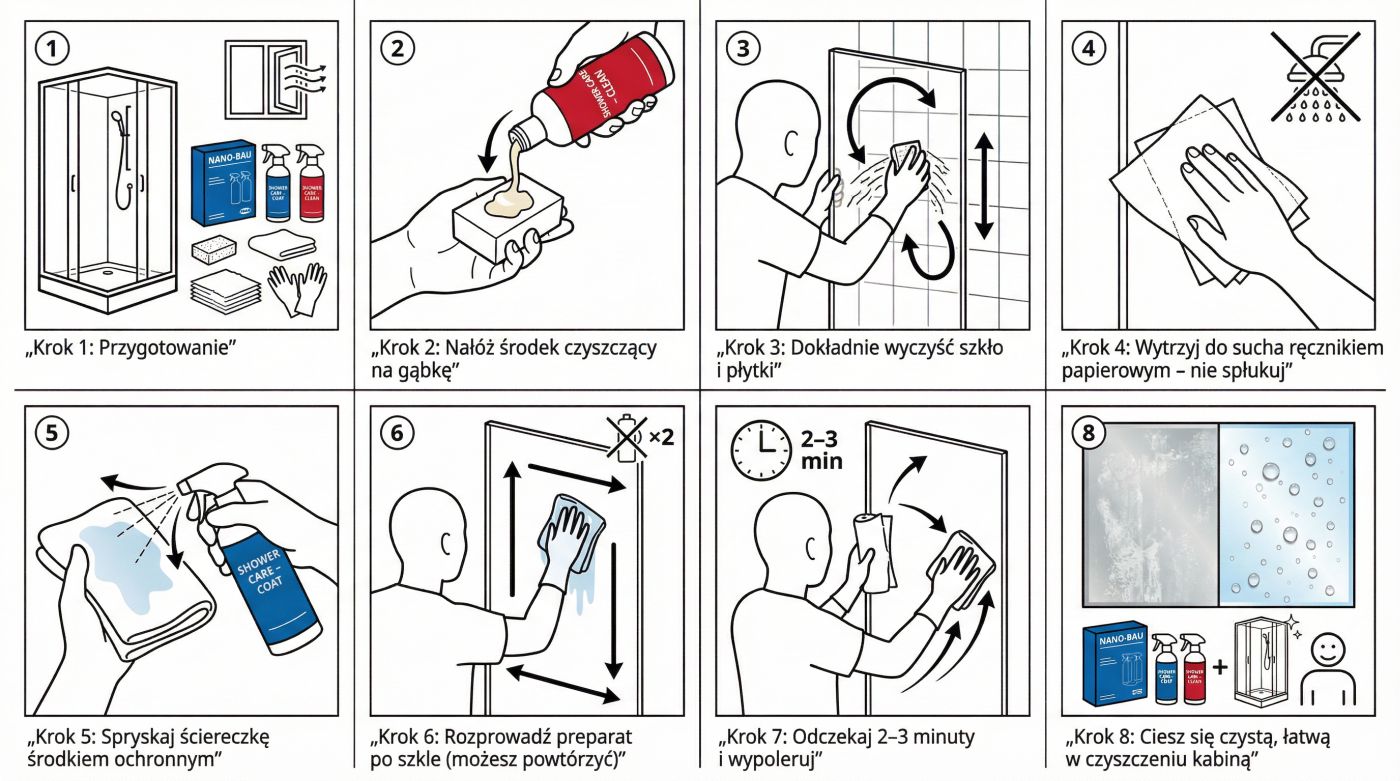Aby Zestaw do kabin prysznicowych NANOBAU shower kit i Smartblond czysty prysznic zadziałał maksymalnie, kluczowe jest przygotowanie powierzchni: musi być odkamieniona, czysta i sucha, a po aplikacji zapewnij brak kontaktu z wodą minimum 6 godzin. System składa się z dwóch preparatów. Najpierw użyj NANO-BAU SHOWER CARE – CLEAN (mleczko): wstrząśnij, nanieś na gąbkę i dokładnie przemyj powierzchnię; biały osad po czyszczeniu zetrzyj papierem, nie spłukuj wodą (delikatny pył może pozostać). Następnie od razu aplikuj NANO-BAU SHOWER CARE – COAT: nakładaj fragmentami, zwilżając ściereczkę, pozostawiając widoczny ślad i polerując do 2 minut do pełnego połysku; ewentualne smugi po ok. 3 godzinach usuń płynem do szyb lub wodą z detergentem.