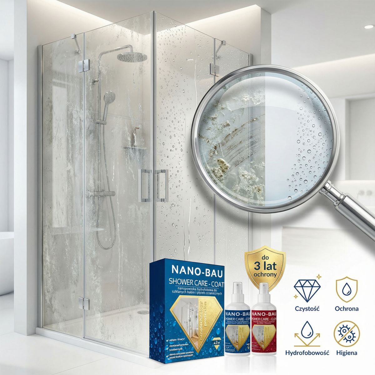 Do czego służy NANO-BAU SHOWER CARE Kit?To zestaw do zabezpieczenia powierzchni w łazience – głównie szkła kabin prysznicowych oraz ceramiki szkliwionej. Po aplikacji powierzchnia staje się hydrofobowa, co ogranicza osadzanie mydlin i kamienia oraz ułatwia mycie.
